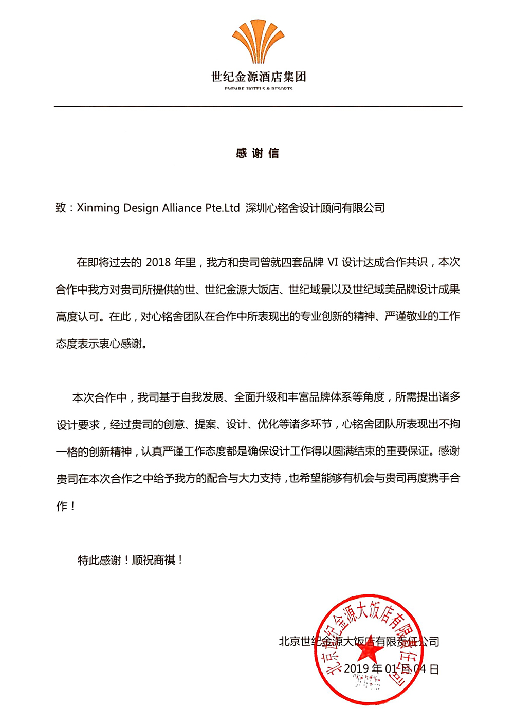 世紀(jì)金源酒店集團,中國酒店管理集團30強,以其“自主設(shè)計、自主建造、自主經(jīng)營、自主管理”的獨創(chuàng)運營模式和“以情服務(wù)、用心做事”的企業(yè)理念贏得了賓客的青睞和社會各界的廣泛贊譽。集團旗下?lián)碛形逍羌壘频?0家,客房總數(shù)達到10000余間套,遍及北京、西安、合肥、重慶、長沙、福州、福州貴安、福州羅源、貴陽、寧波、昆明、騰沖、西雙版納等城市地區(qū),形成了品牌化、連鎖化、規(guī)模化的發(fā)展模式。集團用細致殷勤的專業(yè)服務(wù),為賓客帶來賓至如歸的溫馨感受,提供更多與眾不同的品質(zhì)服務(wù)與全新的美好體驗。公司以“務(wù)實高效,開拓進取”為企業(yè)精神,務(wù)求使賓客無論下榻哪一家世紀(jì)金源酒店,都能體驗始終如一的世紀(jì)金源品質(zhì),盡享殷切貼心的世紀(jì)金源關(guān)懷。2017年,以下為世紀(jì)金源集團委托心銘舍打造的世紀(jì)金源大飯店VI視覺升級系統(tǒng)。