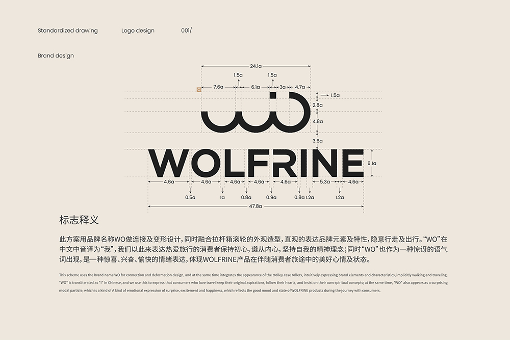 我們的創(chuàng)意源自對世界的熱愛和對自由的追求。WOLFRINE的旅行箱代表了無窮的可能,旨在陪伴您勇往直前。輪子造型LOGO是對我們創(chuàng)意的詮釋,同時也代表了產(chǎn)品的輕巧和堅固。使用金色與白色品牌主色調(diào)是奢華與純凈的結(jié)合,反映了WOLFRINE產(chǎn)品的精致與簡約。