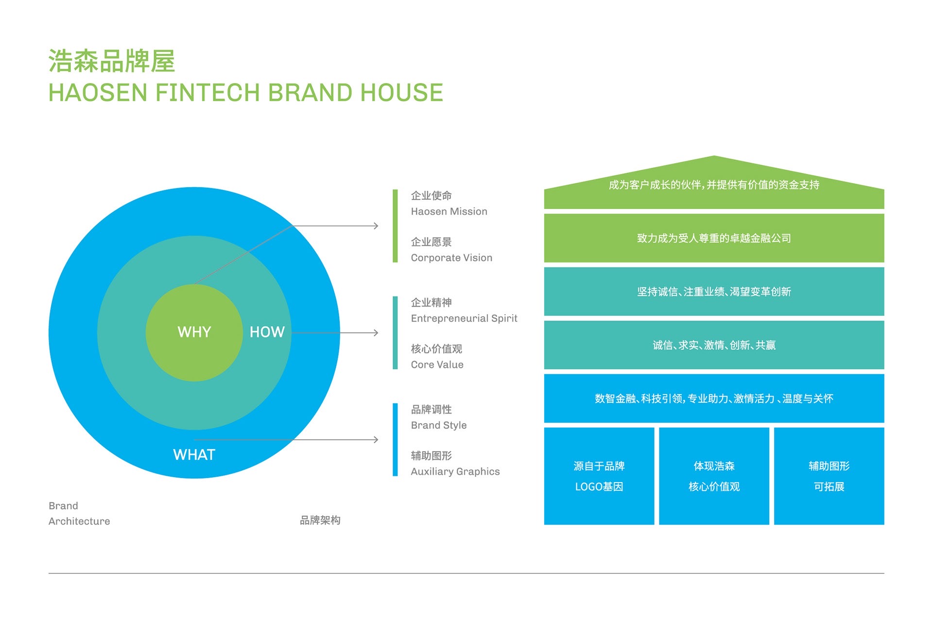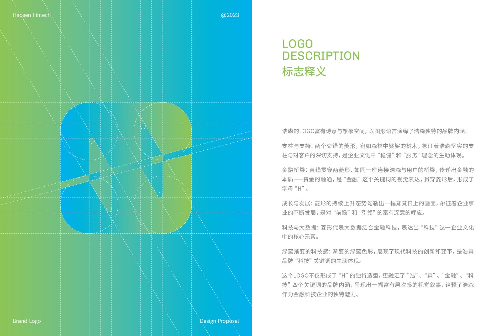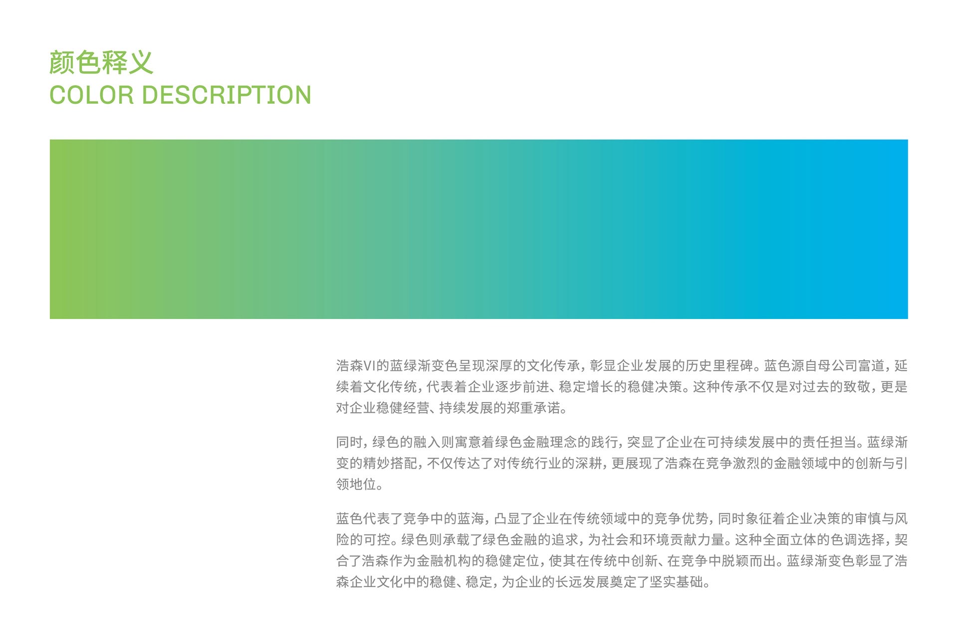 藍色代表了競爭中的藍海,凸顯了企業(yè)在傳統(tǒng)領(lǐng)域中的競爭優(yōu)勢,同時象征著企業(yè)決策的審慎與風險的可控。綠色則承載了綠色金融的追求,為社會和環(huán)境貢獻力量。這種全面立體的色調(diào)選擇,契合了浩森作為金融機構(gòu)的穩(wěn)健定位,使其在傳統(tǒng)中創(chuàng)新、在競爭中脫穎而出。藍綠漸變色彰顯了浩森企業(yè)文化中的穩(wěn)健、穩(wěn)定,為企業(yè)的長遠發(fā)展奠定了堅實基礎(chǔ)。