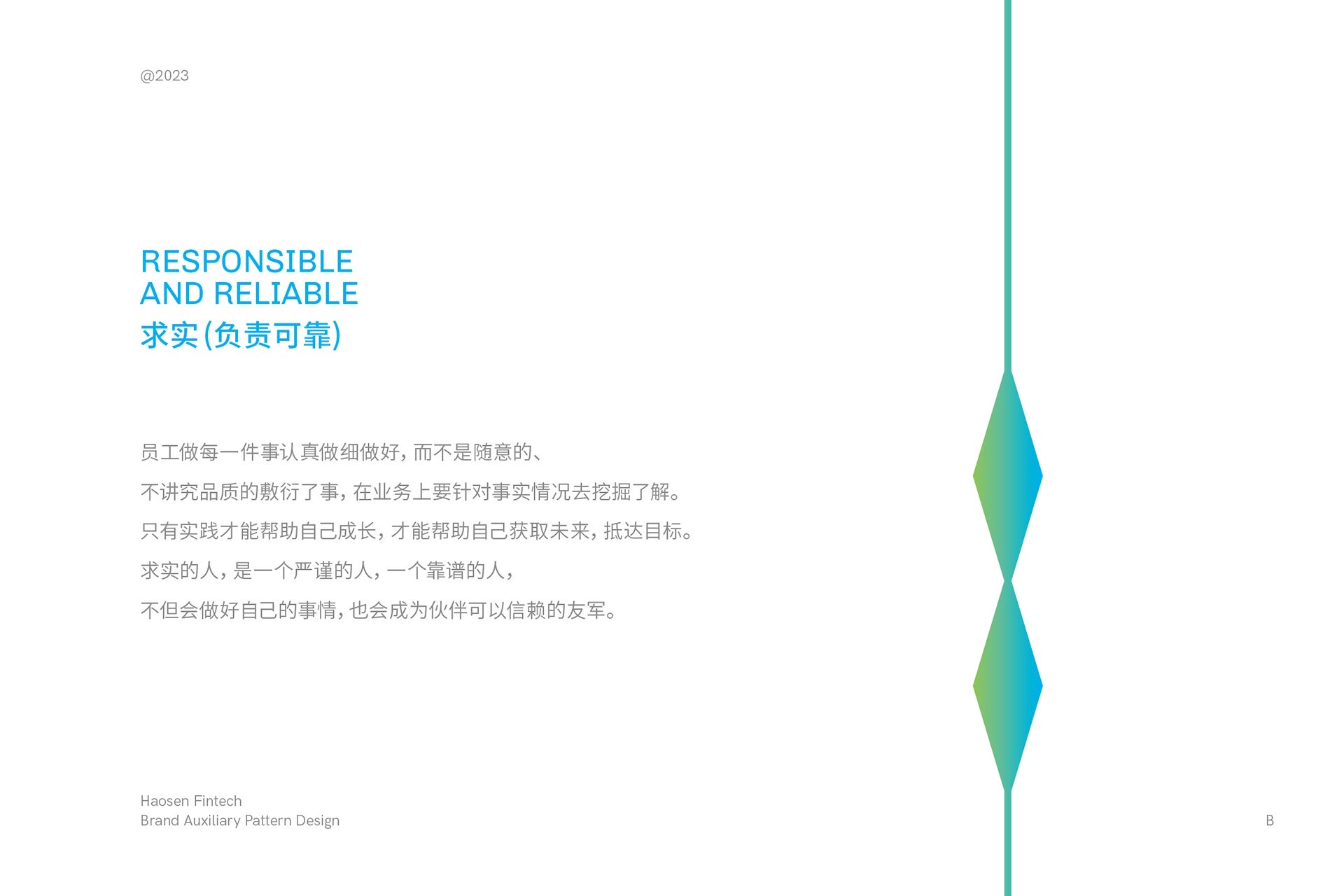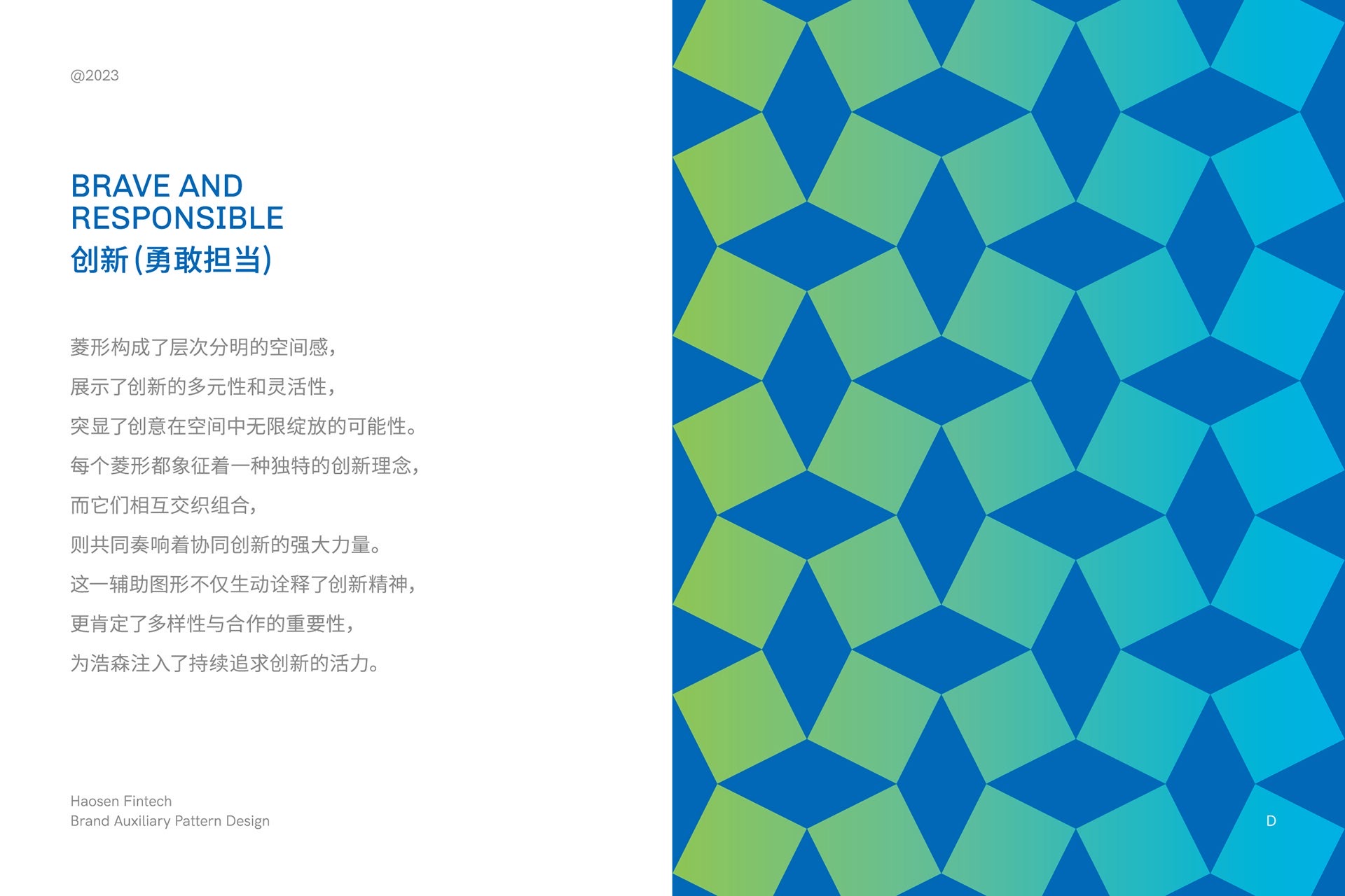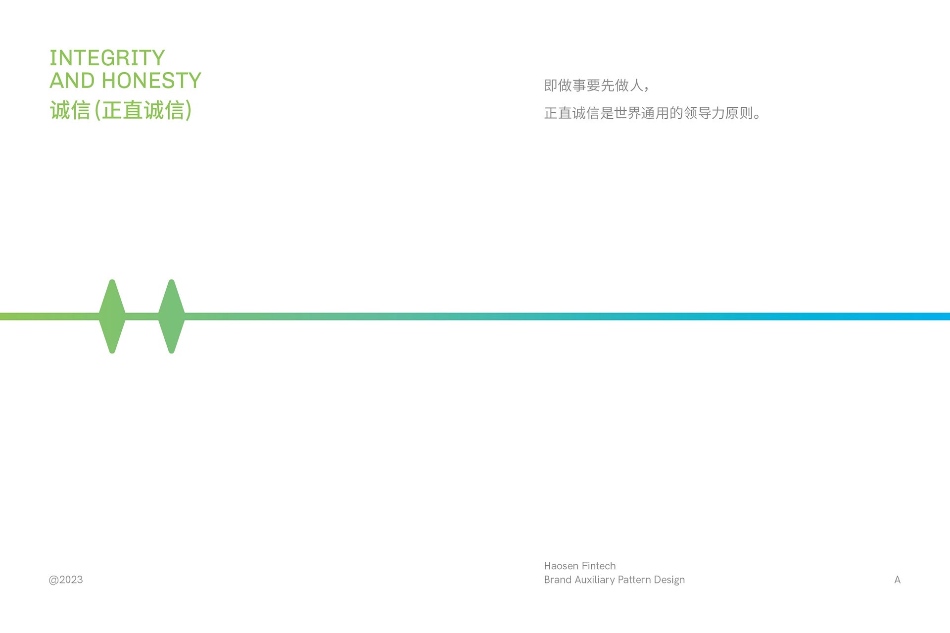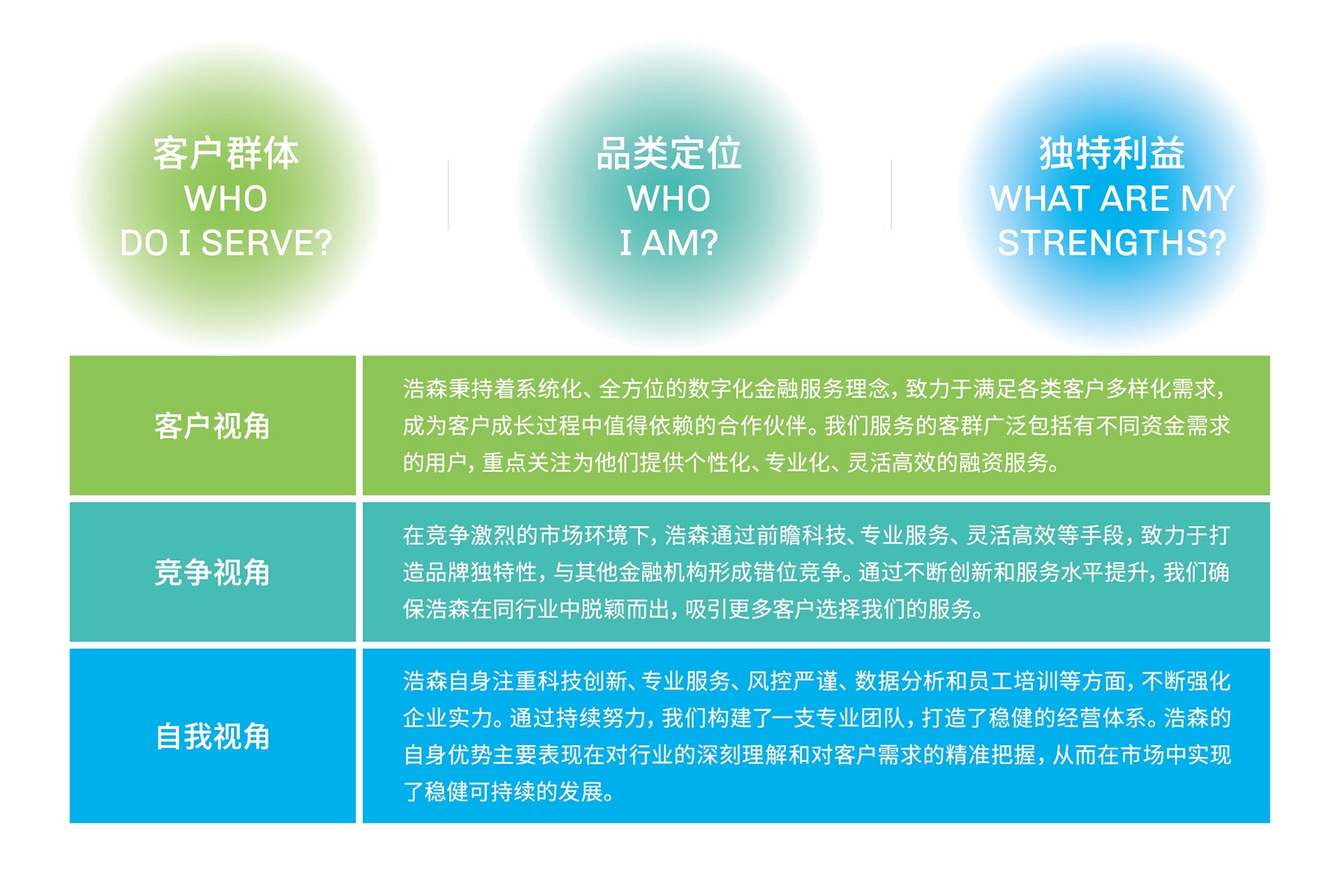 藍色代表了競爭中的藍海,凸顯了企業(yè)在傳統(tǒng)領(lǐng)域中的競爭優(yōu)勢,同時象征著企業(yè)決策的審慎與風險的可控。綠色則承載了綠色金融的追求,為社會和環(huán)境貢獻力量。這種全面立體的色調(diào)選擇,契合了浩森作為金融機構(gòu)的穩(wěn)健定位,使其在傳統(tǒng)中創(chuàng)新、在競爭中脫穎而出。藍綠漸變色彰顯了浩森企業(yè)文化中的穩(wěn)健、穩(wěn)定,為企業(yè)的長遠發(fā)展奠定了堅實基礎(chǔ)。