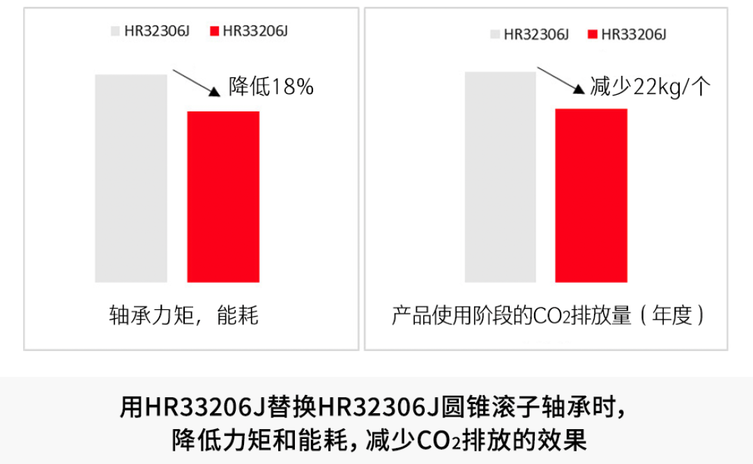 例:圓錐滾子軸承HR32306J可用較小的HR33206J代替。據估計,更換后軸承力矩和能耗可降低約18%,在產品使用階段每年可節(jié)約電能*4 約48kWh,相當于減少CO2排放量*4 約22kg。