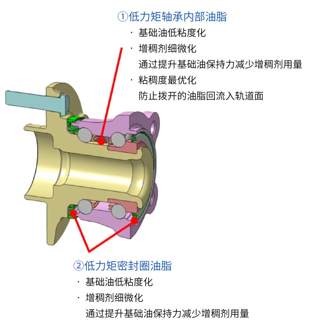 通過增稠劑尺寸的微細(xì)化,在不降低基礎(chǔ)油的保持力的情況下成功地削減了增稠劑量,進一步實現(xiàn)了潤滑脂的低粘度化。這些改進減少了密封圈旋轉(zhuǎn)時由油脂引起的阻力,并降低了行駛時的旋轉(zhuǎn)摩擦力矩。